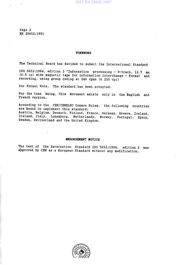 EN 25652:1991 is a standard published by the European Committee for Standardization (CEN). Its full title is "Information processing - 9-track, 12.7 mm (0.5) wide magnetic tape for information interchange - Format and recording, using group coding at 246 cpmm (6250 cpi) (ISO 5652:1984, ed. 2)". This standard covers: Information processing - 9-track, 12.7 mm (0.5) wide magnetic tape for information interchange - Format and recording, using group coding at 246 cpmm (6250 cpi) (ISO 5652:1984, ed. 2)