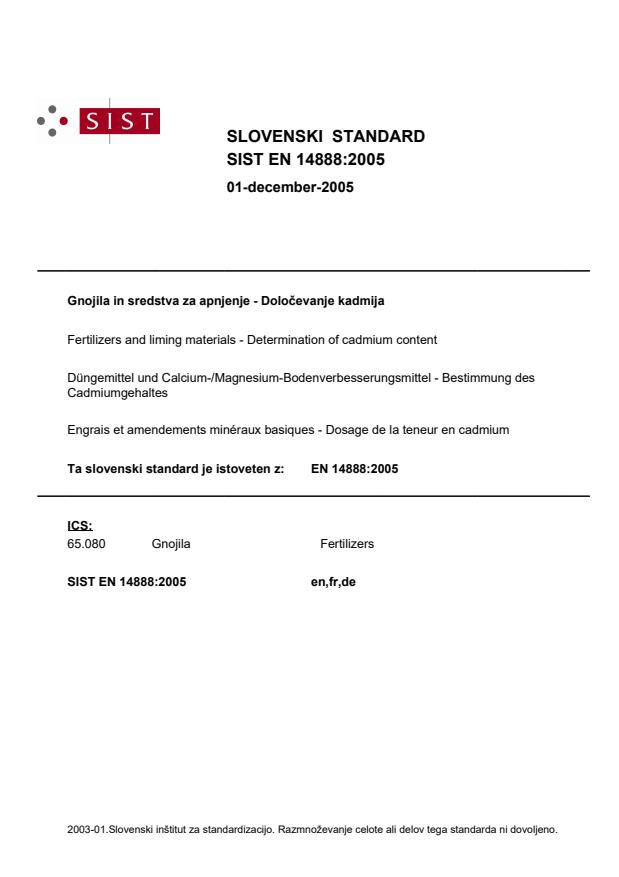 EN 14888:2005 is a standard published by the European Committee for Standardization (CEN). Its full title is "Fertilizers and liming materials - Determination of cadmium content". This standard covers: This European Standard specifies two methods for the determination of the cadmium content, after extraction with nitric acid, of solid mineral fertilizers and rock phosphates. It is not applicable to organic and organo-mineral fertilizers. It is applicable to the determination of cadmium contents greater than 1 mg/kg.