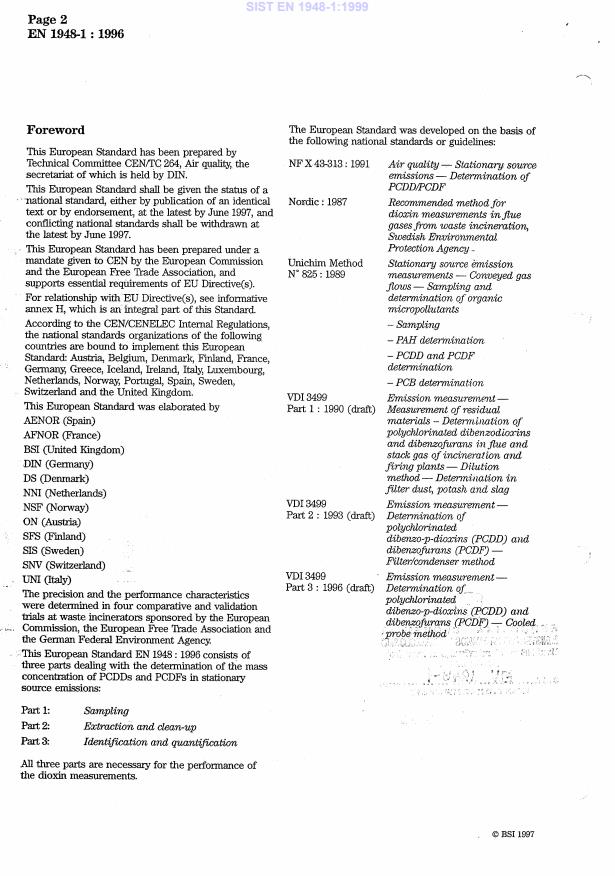 This part of the Standard specifies the sampling of PCDDs/PCDFs. It is an integral part of the complete measurement procedure. The use of the other two parts EN 1948-2:1996 and EN 1948-3:1996 describing extraction and clean-up and identification and quantification, respectively, is necessary for the determination of the PCDDs and PCDFs.