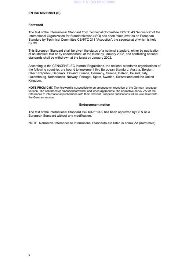 EN ISO 6926:2001 is classified under the following ICS (International Classification for Standards) categories: 17.140.01 - Acoustic measurements and noise abatement in general. The ICS classification helps identify the subject area and facilitates finding related standards.