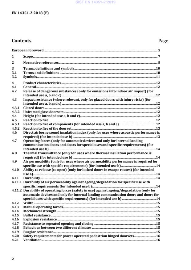 Durability of air permeability against ageing/degradation for specific use with specific requirements (for intended use b): The durability of this characteristic depends on the gaskets. When assessed in accordance to 5.11.1, results shall comply with EN 12365-1:2003, 4.4, 4.6 and 4.7, and expressed as classes according to EN 12365-1:2003, 4.1. 4.11.2 Durability of operating forces (safety in use) against ageing/degradation (only for automatic devices and only for internal landing communication doors and doors for special uses with specific requirements) (for intended use b) Only when power operated doorsets are safeguarded by limitation of forces against impact hazards the durability of operating forces against ageing and degradation shall be tested according to 5.11.2. SIST EN 14351-2:2019