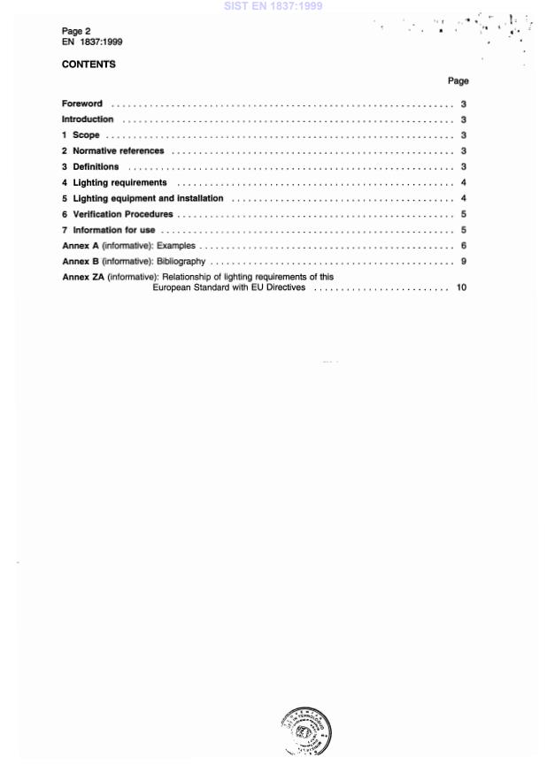 EN 1837:1999 is a standard published by the European Committee for Standardization (CEN). Its full title is "Safety of machinery - Integral lighting of machines". This standard covers: This standard specifies the parameters of integral lighting systems designed to provide illumination in and/or at both stationary and mobile machines to enable the safe use of the machine and the efficient performance of the visual task within and/or at the machine to be carried out. This standard does not specify lighting systems mounted on the machine to specifically illuminate visual tasks outside the machine. The function and requirements of these systems are specified in the European Standard dealing with the lighting of work places. This European Standard is under preparation. This standard does not establish additional requirements for the operation of lighting systems - in severe conditions (extreme environmental conditions such as freezer applications, high temperatures, etc.); - subject to special rules (e.g. explosive atmospheres); - where the transmittance is reduced by environmental conditions, such as smoke, splashing, etc.