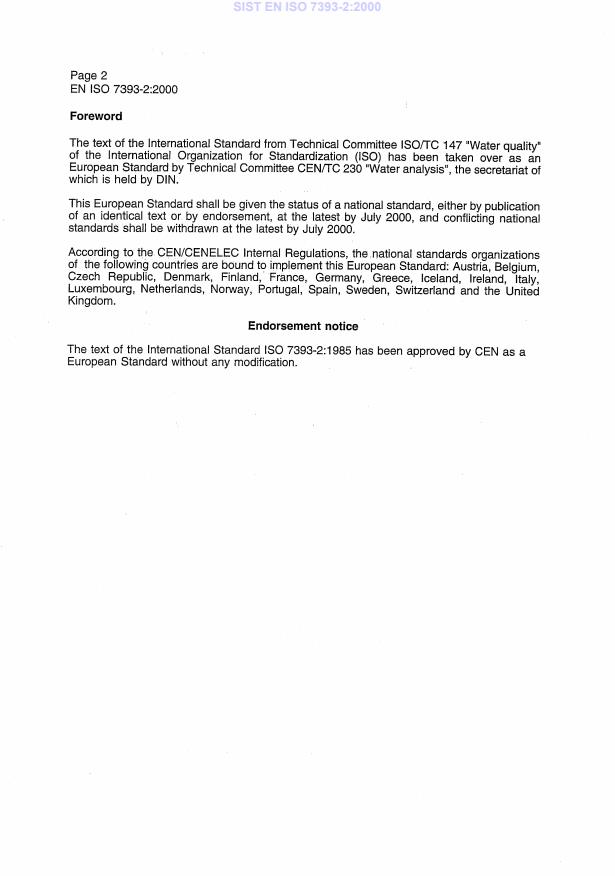 EN ISO 7393-2:2000 is associated with the following European legislation: EU Directives/Regulations: 98/83/EC. When a standard is cited in the Official Journal of the European Union, products manufactured in conformity with it benefit from a presumption of conformity with the essential requirements of the corresponding EU directive or regulation.