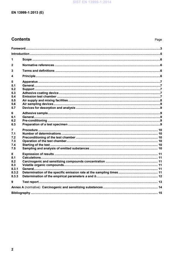 Foreword .3 Introduction .5 1 Scope .6 2 Normative references .6 3 Terms and definitions .6 4 Principle .6 5 Apparatus .7 5.1 General .7 5.2 Support .7 5.3 Adhesive coating device .7 5.4 Emission test chamber .7 5.5 Air supply and mixing facilities .8 5.6 Air sampling devices .9 5.7 Devices for desorption and analysis .9 6 Adhesive sample.9 6.1 General .9 6.2 Pre-conditioning .9 6.3 Preparation of a test specimen .9 7 Procedure . 10 7.1 Number of determinations . 10 7.2 Preconditioning of the test chamber . 10 7.3 Operation of the test chamber . 10 7.4 Starting of the test . 10 7.5 Sampling and analysis of emitted substances . 10 8 Expression of results . 11 8.1 Calculations . 11 8.2 Carcinogenic and sensitizing compounds concentration . 11 8.3 Volatile organic compounds . 11 8.3.1 General . 11 8.3.2 Determination of the specific emission rate at the sampling times . 11 8.3.3 Determination of the empirical parameters a and b . 12 9 Test report . 13 Annex A (normative)