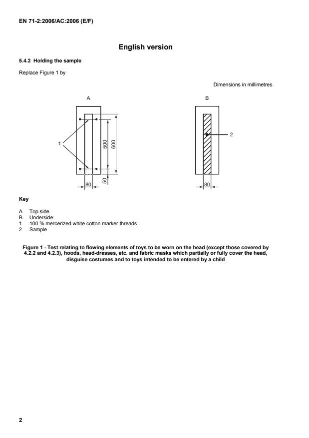 EN 71-2:2006/AC:2006 is a corrigendum published by the European Committee for Standardization (CEN). Its full title is "Safety of toys - Part 2: Flammability". This standard covers: CMC - Replace Figures 1 and 2 (editorial error)