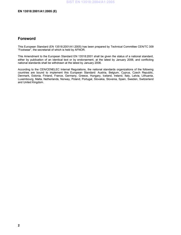 EN 13518:2001/A1:2005 is classified under the following ICS (International Classification for Standards) categories: 61.060 - Footwear. The ICS classification helps identify the subject area and facilitates finding related standards.