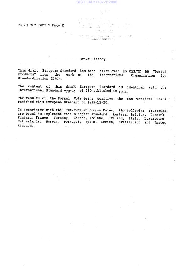 Foreword IS0 (the International Organization for Standardization) is a worldwide federation of national standards bodies (IS0 member bodies). The work of preparing International Standards is normally carried out through IS0 technical committees. Each member body interested in a subject for which a technical committee has been established has the right to be represented on that committee. International organizations, govern- mental and non-governmental, in liaison with ISO, also take part in the work. Draft International Standards adopted by the technical committees are circulated to the member bodies for approval before their acceptance as International Standards by the IS0 Council. They are approved in accordance with IS0 procedures requiring at least 75 % approval by the member bodies voting. International Standard IS0 7787/l was prepared by Technical Committee ISO/TC 106, Dentistry, in collaboration with the following international organization : FDI (International Dental Federation). 0 International Organization for Standardization, 1984 Printed in Switzerland SIST EN 27787-1:2000