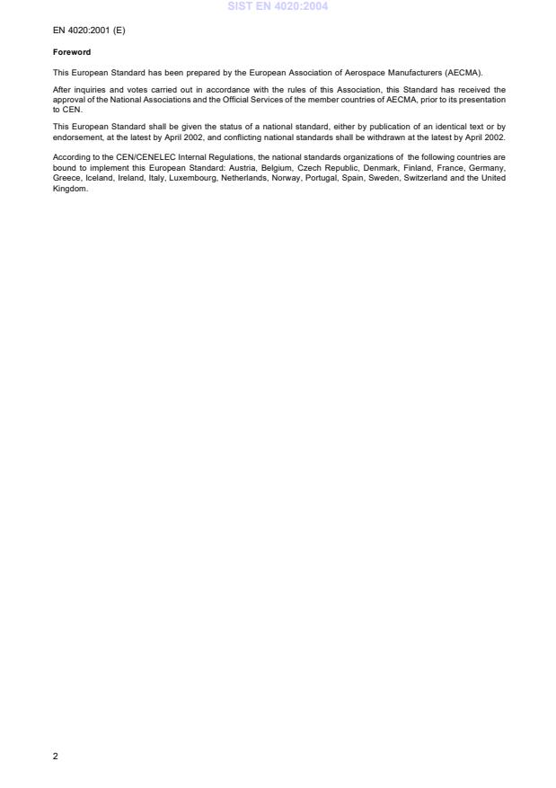 B-1050 Brussels© 2001 CENAll rights of exploitation in any form and by any means reservedworldwide for CEN national Members.Ref. No. EN 4020:2001 ESIST EN 4020:2004