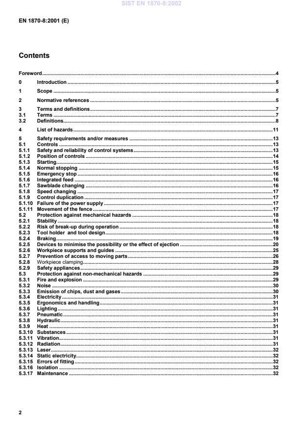 and tool design.185.2.4Braking.195.2.5Devices to minimise the possibility or the effect of ejection.205.2.6Workpiece supports and guides.255.2.7Prevention of access to moving parts.265.2.8Workpiece clamping.285.2.9Safety appliances.295.3Protection against non-mechanical hazards.295.3.1Fire and explosion.295.3.2Noise.305.3.3Emission of chips, dust and gases.305.3.4Electricity.315.3.5Ergonomics and handling.315.3.6Lighting.315.3.7Pneumatic.315.3.8Hydraulic.315.3.9Heat.315.3.10Substances.315.3.11Vibration.315.3.12Radiation.315.3.13Laser.325.3.14Static electricity.325.3.15Errors of fitting.325.3.16Isolation.325.3.17Maintenance.32SIST EN 1870-8:2002