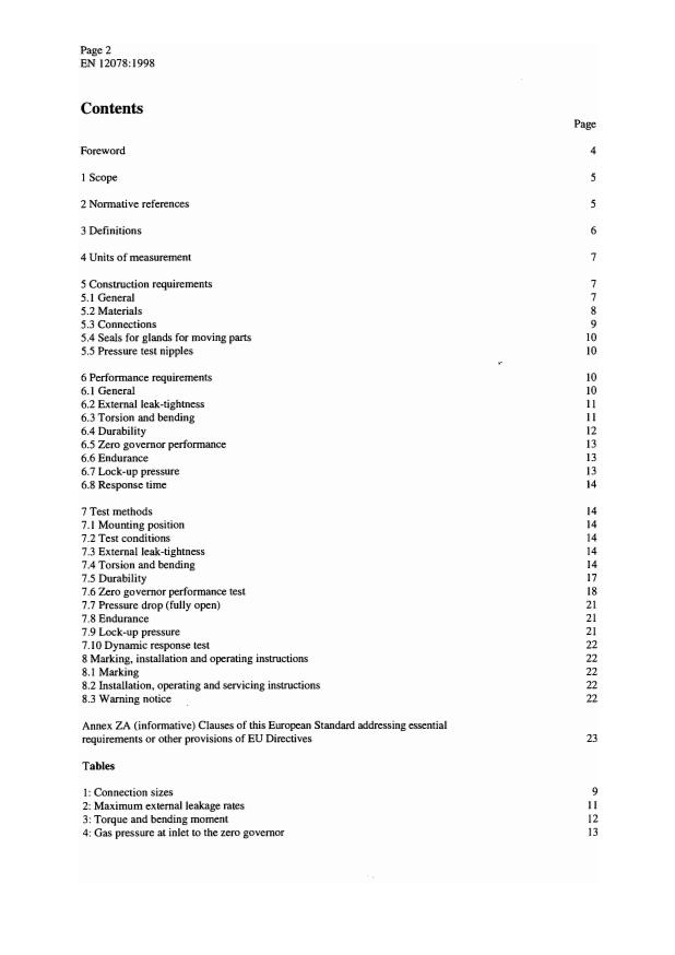 EN 12078:1998 is a standard published by the European Committee for Standardization (CEN). Its full title is "Zero governors for gas burners and gas burning appliances". This standard covers: This standard specifies he safety, constructional and performance requirements for zero pressure governors, hereafter referred to as zero governors, intended for use with gas appliances. It also gives the test procedures for evaluating these requirements and information necessary for the purchaser and user. This standard applies to zero governors for gas-burning appliances that may be used and tested independently of these appliances. These zero governors are suitable for one or more of the fuel gases of the 1st, 2nd and 3rd families, at inlet pressures up to and including 200 mbar. This standard does not cover : a) zero governors connected directly to distribution pipework or to container that maintains a standard distribution pressure; b) zero governors intended for gas appliances to be installed out-of-doors and exposed to the environment. This standard covers type testing only.