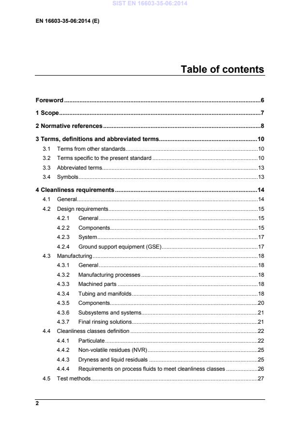 Standard ECSS-E-ST-35-06 sodi na pogonsko področje strojništva in zajema zahteve za čistočo pogonskih sestavnih delov, podsistemov in sistemov Standard - določa zahteve za projekt, ki omogočajo čiščenje pogonskih sestavnih delov podsistemov in sistemov in ki se izognejo nastajanju ali neželenemu nabiranju onesnaženja, - opredeljuje zahteve za čistočo (npr. kateri delec/nečistoča/raven vlažnosti je še dopusten), - določa zahteve glede čiščenja v skladu z zahtevami ravni čistoče in zahtevami za verifikacijo, - opredeljuje pristop za čistočo, zahteve za čiščenje (npr. kaj je treba storiti, da se zagotovi, da dopustna raven ni presežena, zahteve za združljivost), - opredeljuje, specificira in določa zahteve v zvezi s pogoji, pod katerimi poteka preverjanje čiščenja ali čistoče (npr. združljivost, preverjanje po okoljskem preskusu). Ta standard velja za večino najbolj pogosto uporabljenih pogonskih sistemov in njihovih povezanih, shranjenih kombinacij goriv: hidrazin (N2H4), monometil hidrazin (CH3N2H3), MON (mešani dušikovi oksidi), dušik (N2), helij (He), propan (C3H8), butan (C4H10) in ksenon (Xe). Ta standard je temelj za industrijo evropskih vesoljskih plovil in pogonsko industrijo za vesoljska plovila za določitev, doseganje in preverjanje zahtevanih ravni čistoče v pogonskem sistemu vesoljskega plovila. Ta standard še zlasti velja za pogon vesoljskih plovil, kot se uporablja za satelite in vesoljska plovila (s posadko) in katerega koli od teh projektov, vključno s podporno opremo na tleh. Zahteve za zunanjo čistočo, npr. izven rezervoarjev in cevi, in vidiki, kot so glive in razplinjevanje, so zajete v standardu ECSS-Q-ST-70-01. Ta standard se lahko prilagodi posameznim lastnostim in omejitvam vesoljskega projekta v skladu s standardom ECSS-S-ST-00.