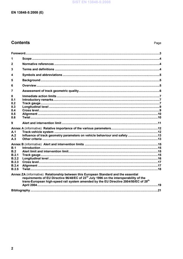 Alert and intervention limits.15 B.1 Introduction.15 B.2 Alert limit and intervention limit.15 B.2.1 Track gauge.15 B.2.2 Longitudinal level.16 B.2.3 Cross level.17 B.2.4 Alignment.17 B.2.5 Twist.18 Annex ZA (informative)