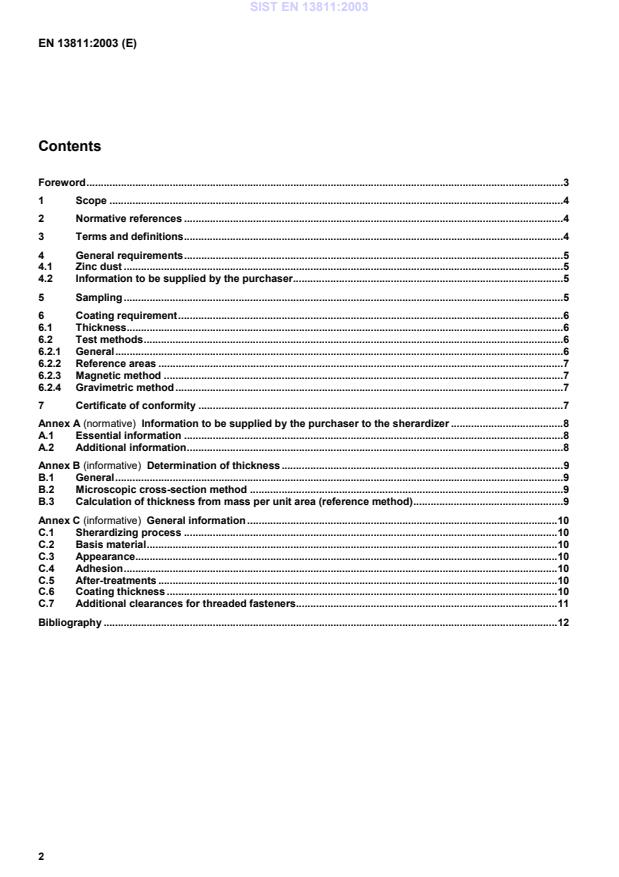 General information.10C.1Sherardizing process.10C.2Basis material.10C.3Appearance.10C.4Adhesion.10C.5After-treatments.10C.6Coating thickness.10C.7Additional clearances for threaded fasteners.11Bibliography.12SIST EN 13811:2003