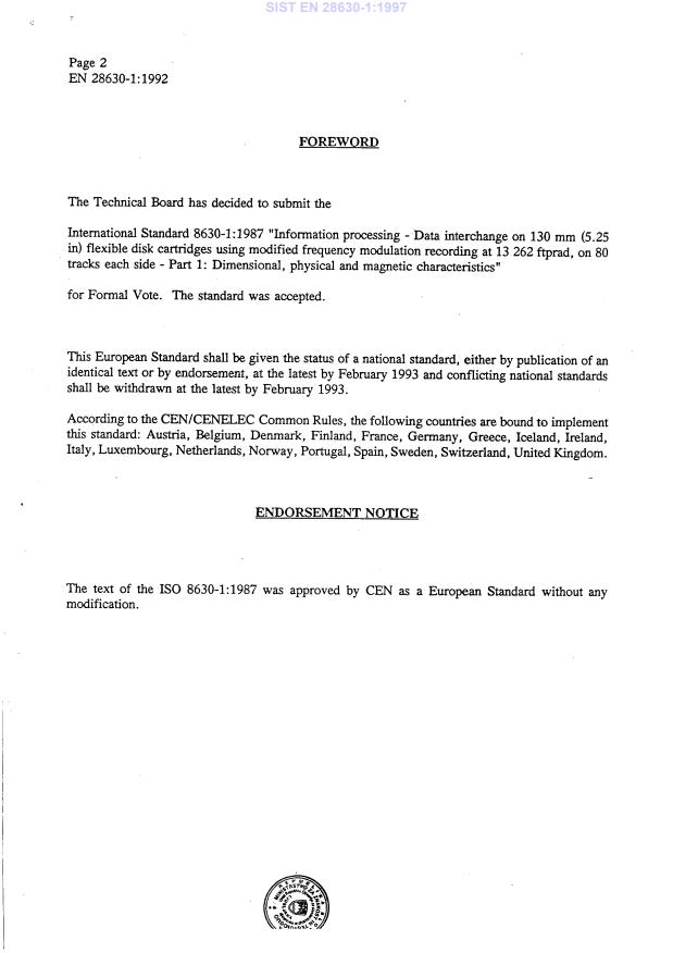 2003-01.Slovenski inštitut za standardizacijo. Razmnoževanje celote ali delov tega standarda ni dovoljeno.Information processing - Data interchange on 130 mm (5.25 in) flexible disk cartridges using modified frequency modulation recording at 13 262 ftprad, on 80 tracks each side - Part 1: Dimensional, physical and magnetic characteristics (ISO 8630-1:1987)Informationsverarbeitung - Datenaustausch auf 130 mm (5,25 in) Disketten mit modifizierter Wechseltaktschrift bei zweiseitiger Aufzeichnung mit 13 262 Flußwechsel/rad und 80 Spuren auf jeder Seite - Teil 1: Maße, physikalische und magnetische Eigenschaften (ISO 8630-1:1987, Ausg. 1)Traitement de l'information - Echange de données sur cartouches a disquettes de 130 mm (5,25 in) utilisant un enregistrement a modulation de fréquence modifiée (MFM) a 13 262 ftprad sur 80 pistes sur chaque face - Partie 1: Caractéristiques dimensionnelles, physiques et magnétiques (ISO 8630-1:1987, éd. 1)Information processing - Data interchange on 130 mm (5.25 in) flexible disk cartridges using modified frequency modulation recording at 13 262 ftprad, on 80 tracks each side - Part 1: Dimensional, physical and magnetic characteristics (ISO 8630-1:1987, ed. 1)35.220.21Magnetni diskiMagnetic disksICS:Ta slovenski standard je istoveten z:EN 28630-1:1992SIST EN 28630-1:1997en01-december-1997SIST EN 28630-1:1997SLOVENSKI