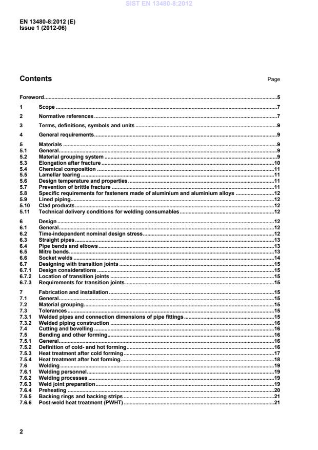 Figures Figure 6.5.1 — Mitre bend . 14 Figure 7.6.3.1 — Socket welds . 20 Figure A.1 — Dimensional details of spools . 30 Tables Table 5.2-1 — Grouping system based on CEN ISO/TR 15608:2000 and allowable materials of construction based on EN 12392:2000 using the EN AW numbers according to EN 573-3:2009 . 10 Table 6.2-1 — Design stresses for aluminium and aluminium alloy material . 12 Table 6.2-2 — Allowable design strength values for 6 000 series aluminium alloys in the welded condition (see 5.6) . 13 Table 6.5-1 — Special symbols for subclause 6.5 . 14 Table 7.3-1 — Tolerances for welded pipes . 16 Table 7.5-1 — Heat treatment of flat products after cold forming . 17 Table 7.5-2 Heat treatment of pipes after cold forming . 18 Table 7.5-3 Heat treatment after hot forming . 18 Table 8.2-1 — Destructive testing of formed and heat treated parts . 23 SIST EN 13480-8:2012