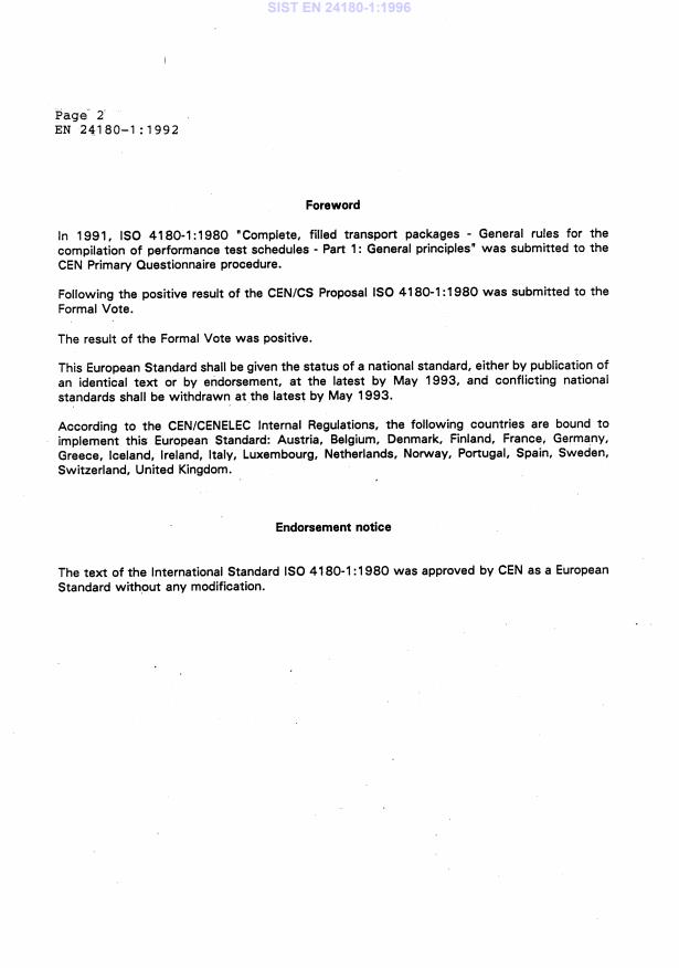 Contents Page 0 Introduction . 1 Scope and field of application. . 2 References . 3 Definifions . 4 Distribution systems. . 5 Hazards . 6 Tests . 7 Performance test schedules. . 8 Standardization of test methods and order of tests . 9 Selection of test intensities . 10 Modification of basic values of intensity . 11 Selection of package attitude . 12 Compilation of test schedules. . 13 Determination of criteria of acceptance. . Annex : Methods of quantifying damage to a package and/or its contents . 1 1 1 1 2 2 2 2 2 3 3 3 4 4 5 . . . Ill SIST EN 24180-1:1996