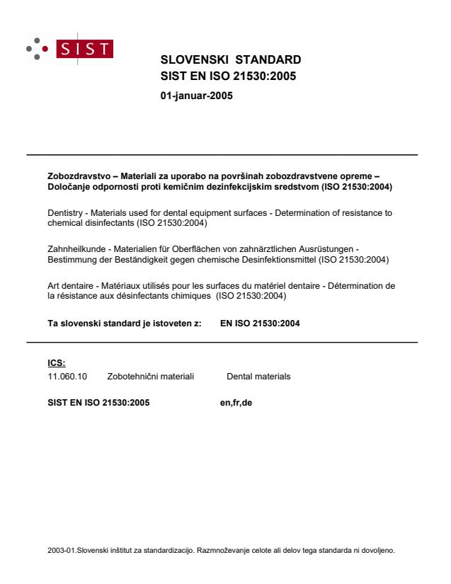 Zobozdravstvo – Materiali za uporabo na površinah zobozdravstvene opreme – Določanje odpornosti proti kemičnim dezinfekcijskim sredstvom (ISO 21530:2004)