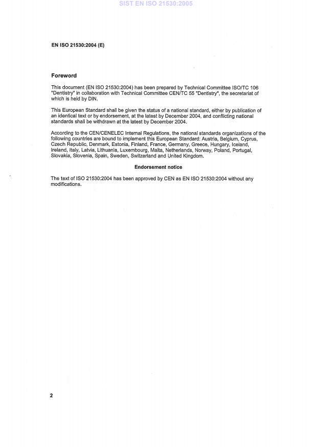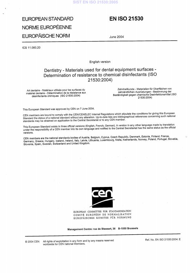 EN ISO 21530:2004 is a standard published by the European Committee for Standardization (CEN). Its full title is "Dentistry - Materials used for dental equipment surfaces - Determination of resistance to chemical disinfectants (ISO 21530:2004)". This standard covers: ISO 21530:2004 specifies test methods for determining the resistance to chemical disinfectants of all materials used for external surfaces of dental equipment intended for such disinfection. Three test methods are specified: an immersion test, a spray test and a contact test. The choice of test method to be used is left to the discretion of the party conducting the testing. ISO 21530:2004 does not address the bactericidal, virucidal and fungicidal effectivity of the disinfectants. ISO 21530:2004 does not provide for testing the possible detrimental effects of applied stress on the resistance of test materials to the test reagents.