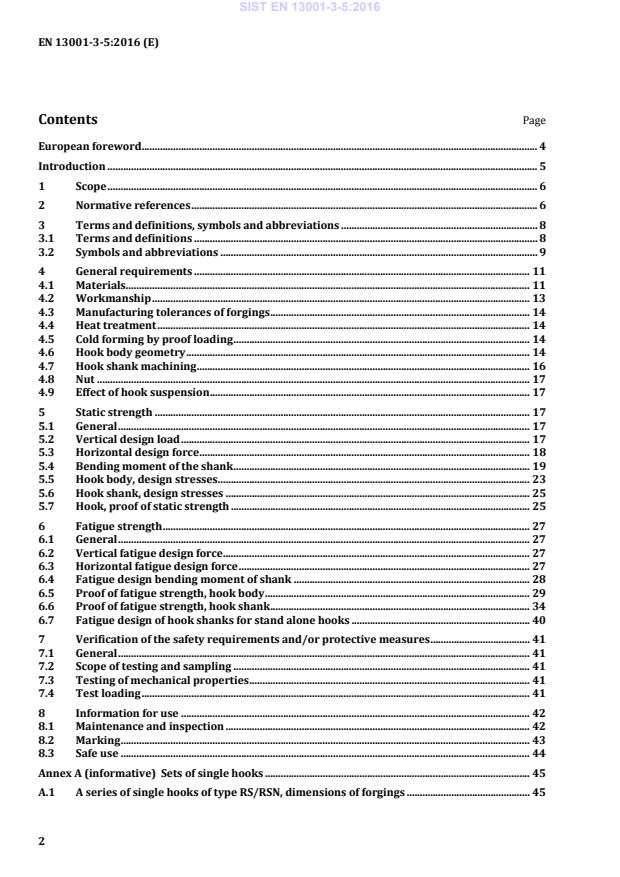 EN 13001-3-5:2016 is a standard published by the European Committee for Standardization (CEN). Its full title is "Cranes - General design - Part 3-5: Limit states and proof of competence of forged hooks". This standard covers: This European Standard is to be used together with EN 13001-1 and EN 13001-2 and, as such, they specify general conditions, requirements and methods to prevent by design and theoretical verification, mechanical hazards in crane hooks. This European Standard covers the following parts of hooks and types of hooks: - bodies of any type of hooks made of steel forgings; - machined shanks of hooks with a thread/nut suspension. Principles of this European Standard can be applied to machined shanks of hooks in general. However, stress concentration factors relevant to designs not given in this standard would have to be determined and applied. NOTE 1 Cast hooks and plate hooks, which are those, assembled of one or several parallel parts of rolled steel plates, are not covered in this European Standard. The following is a list of significant hazardous situations and hazardous events that could result in risks to persons during normal use and foreseeable misuse. Clauses 4 to 8 of this document are necessary to reduce or eliminate the risks associated with the following hazards: a) exceeding the limits of strength (yield, ultimate, fatigue); b) exceeding temperature limits of material. The requirements of this European Standard are stated in the main body of the document and are applicable to forged hook designs in general. The commonly used hook body and shank designs listed in Annexes A, B and F are only examples and should not be referred to as requirements of this European Standard. Annex I gives guidance for the selection of a hook size, where a hook body is in accordance with Annex A or B. The selection of hook form is not limited to those shown in Annexes A and B. This European Standard is applicable to cranes, which are manufactured after the date of approval of this European Standard by CEN, and serves as a reference base for product standards of particular crane types. NOTE 2 This part of EN 13001 deals only with the limit state method in accordance with EN 13001-1.