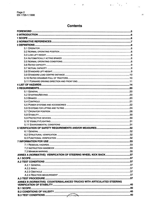 EN 1726-1:1998 is a standard published by the European Committee for Standardization (CEN). Its full title is "Safety of industrial trucks - Self-propelled trucks up to and including 10 000 kg capacity and industrial tractors with a drawbar pull up to and including 20 000 N - Part 1: General requirements". This standard covers: This European Standard applies to self-propelled industrial trucks including masted rough terrain trucks (see clause 3.1.3.1.8 of ISO 5053:1987) with removable and integrated attachments with a rated capacity up to and including 10 000 kg and to tractors with a rated drawbar pull up to and including 20 000 N.