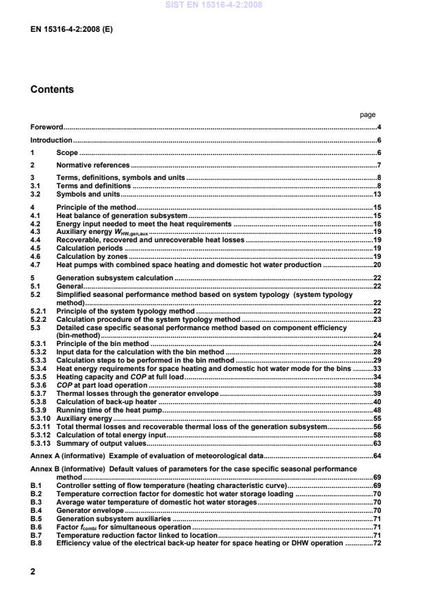 Default values of parameters for the case specific seasonal performance method.69 B.1 Controller setting of flow temperature (heating characteristic curve).69 B.2 Temperature correction factor for domestic hot water storage loading.70 B.3 Average water temperature of domestic hot water storages.70 B.4 Generator envelope.70 B.5 Generation subsystem auxiliaries.71 B.6 Factor fcombi for simultaneous operation.71 B.7 Temperature reduction factor linked to location.71 B.8 Efficiency value of the electrical back-up heater for space heating or DHW operation.72 SIST EN 15316-4-2:2008