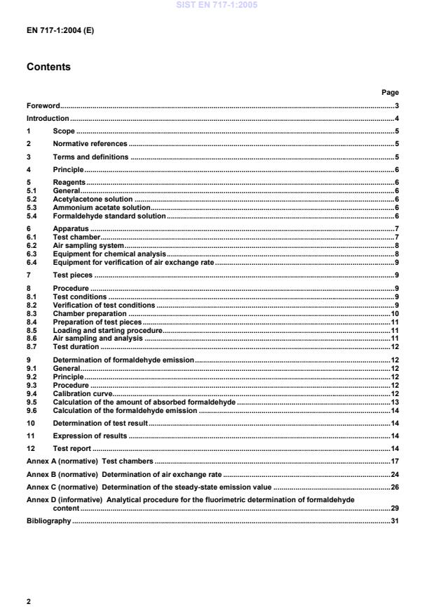1 mg/m³ = 0,81 ppm (parts per million) 4 Principle Test pieces of known surface area, are placed in a chamber, in which the temperature, relative humidity, air velo-city and exchange rate are controlled at defined values. Formaldehyde emitted from the test pieces mixes with the air in the chamber. The air in the chamber is sampled periodically. The formaldehyde concentration is determined by drawing air from the chamber through gas washing bottles containing water, which absorbs the formaldehyde. The formaldehyde concentration in the water is determined. The concentration of formaldehyde in the chamber at-mosphere is calculated from the concentration in the water in the gas washing bottles and the volume of the sam-pled air. It is expressed in milligrams per cubic metre (mg/m3). Sampling is periodically continued until the formal-dehyde concentration in the chamber has reached a steady-state. NOTE The influences of temperature, relative humidity, loading factor and air exchange rate on the formaldehyde concen-tration in the chamber atmosphere can be described by formulas (e.g. Andersen formula). An interrelation between the structure of the test pieces, especially of their surfaces and the air velocity is also apparent but cannot be exactly described by a formula. 5 Reagents 5.1 General Reagents and water of recognised analytical purity shall be used for the analysis. 5.2 Acetylacetone solution 4 ml acetylacetone are added to a 1 000 ml volumetric flask and made up to the mark with water. 5.3 Ammonium acetate solution 200 g ammonium acetate are dissolved in water in a 1 000 ml volumetric flask and made up to the mark. NOTE Commercially prepared solutions may be used. 5.4 Formaldehyde standard solution Standard iodine solution c(l2) = 0,05 mol/l Standard sodium thiosulphate solution c(Na2S2O3) = 0,1 mol/l Standard sodium hydroxide solution c(NaOH) = 1 mol/l Standard sulphuric acid solution c(H2SO4) = 1 mol/l SIST EN 717-1:2005