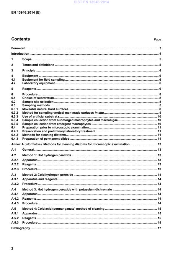Methods for cleaning diatoms for microscopic examination . 13 A.1 General . 13 A.2 Method 1: Hot hydrogen peroxide . 13 A.2.1 Apparatus . 13 A.2.2 Reagents . 13 A.2.3 Procedure . 13 A.3 Method 2: Cold hydrogen peroxide . 14 A.3.1 Apparatus and reagents . 14 A.3.2 Procedure . 14 A.4 Method 3: Hot hydrogen peroxide with potassium dichromate . 14 A.4.1 Apparatus . 14 A.4.2 Reagents . 14 A.4.3 Procedure . 14 A.5 Method 4: Cold acid (permanganate) method of cleaning . 15 A.5.1 Apparatus . 15 A.5.2 Reagents . 15 A.5.3 Procedure . 15 Bibliography . 17