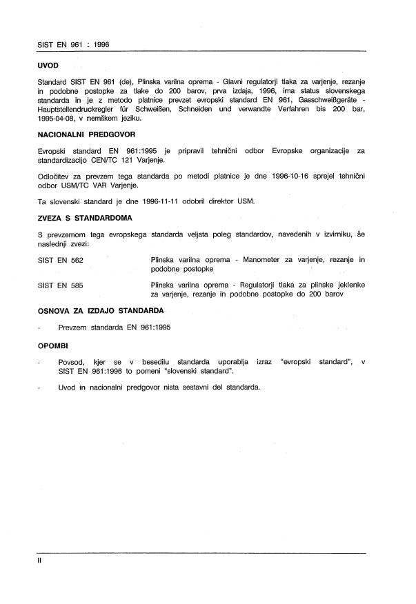 EN 961:1995 is a standard + national annex and/or foreword published by the European Committee for Standardization (CEN). Its full title is "Gas welding equipment - Manifold regulators used in welding, cutting and allied processes up to 200 bar". This standard covers: This standard specifies requirements and test methods for manifold regulators for welding, cutting and allied processes. It is applicable to regulators normally used for compressed gases up to 200 bar (20 MPa), for dissolved acetylene, methylacetylene-propadine-mixtures (MPS) and carbondioxide (CO2), to regulate the pressure at the outlet of high-pressure lines from manifold gas cylinders. It is not applicable to regulators fitted directly to the gas cylinders, as defined in EN 585 or to regulators for liquefied petroleum gases.