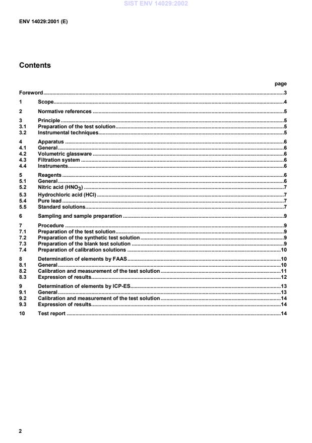 ENV 14029:2001 is a standardization document published by the European Committee for Standardization (CEN). Its full title is "Lead and lead alloys - Analysis by flame atomic absorption spectrometry (FAAS) or inductively coupled plasma emission spectrometry (ICP-ES), after separation of the lead matrix". This standard covers: This European Prestandard specifies methods using flame atomic absorption spectrometry (FAAS) and inductively coupled plasma emission spectrometry (ICP-ES) for the determination of elements at low content in lead for the ranges given in Table 1. Higher contents than those listed in Table 1 should be determined according to ENV 13800. Table 1 - Ranges of application for the determination of elements Element Ranges of applications (% m/m) FAAS ICP-ES Ag 0,00001 - 0,001 0,00001 - 0,001 Al 0,0001 - 0,005 0,00005 - 0,005 As 0,0002 - 0,005 0,00005 - 0,005 Bi 0,00005 - 0,0025 0,00005 - 0,0025 Ca 0,00005 - 0,001 0,00001 - 0,001 Cd 0,00005 - 0,001 0,00001 - 0,001 Co 0,00005 - 0,001 0,00005 - 0,001 Cr 0,00005 - 0,001 0,00005 - 0,001 Cu 0,00001 - 0,001 0,00001 - 0,001 Fe 0,00005 - 0,001 0,00005 - 0,001 Mg 0,00005 - 0,001 0,00005 - 0,001 Mn 0,00005 - 0,001 0,00005 - 0,001 Na 0,00005 - 0,001 0,00001 - 0,001 Ni 0,00005 - 0,001 0,00001 - 0,001 Sb 0,0002 - 0,0025 0,0002 - 0,0025 Se 0,0002 - 0,005 0,0002 - 0,005 Sn 0,0005 - 0,005 0,0002 - 0,005 Te 0,00002 - 0,0025 0,00002 - 0,0025 TI 0,00002 - 0,0025 0,00002 - 0,0025 Zn 0,00001 - 0,001 0,00001 - 0,001 These methods are intended as the definitive methods in case of dispute for the determination of elements at low content in lead. They are also recommended for the analysis of Certified Reference Materials (CRM) and Reference Materials (RM) which are used in analysis according to ENV 12908.