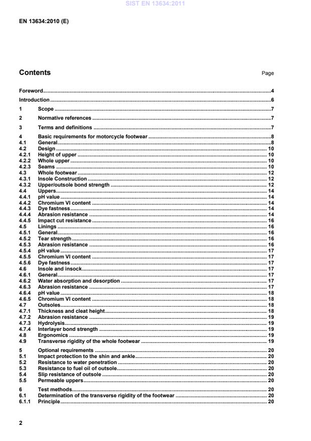 EN 13634:2002: a) The title and scope have been modified; the scope is not any more limited to professional motorcycle riders; b) Two distinct performance levels have been introduced; c) Definitions for protective layer and professional rider were deleted; d) Minimum number of samples and test specimens and their origin specified; e) Height of upper specified depending on the footwear size; f) Design requirements for seams specified more precisely in Figure 1; g) Basic requirements for insoles and insocks specified in more detail; h) Requirement added for CrVI content of leather in upper and lining; i) Abrasion resistance requirement modified for upper, linings and insoles and insocks; j) Impact zones and material areas for upper resistance to impact cut specified; k) Requirement and test method for impact cut resistance modified; l) Optional requirement for slip resistance of outsole included; m) Optional requirement for permeable uppers included; n) Marking requirements modified; SIST EN 13634:2011