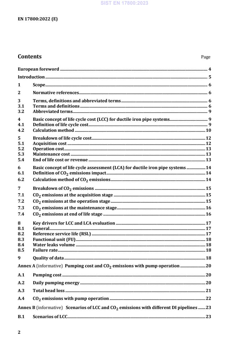 EN 17800:2022 is a standard published by the European Committee for Standardization (CEN). Its full title is "Life cycle cost (LCC) and life cycle assessment (LCA) for CO2 emissions in ductile iron pipe systems". This standard covers: This document specifies the evaluation method of life cycle cost (LCC) and Life cycle assessment (LCA) of ductile iron pipes and fittings used for water applications and which are in compliance with EN 545. LCC evaluation is based on concepts and methods developed in ISO 15686 5. LCA evaluation is based on concepts and methods developed in ISO 15686 6, EN 15804:2012+A2:2019, EN ISO 14040 and EN ISO 14044. In this document, LCA is limited to the evaluation of environmental impact due to CO2 emissions associated with the consumption of natural resources or energy and waste disposal. The other categories of impacts are not in the scope of this document. Informative annexes are included in this document as a compilation of references, consensual factors, and scenarios with different DI pipelines.