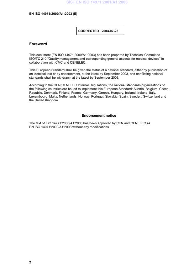 This amendment A1 modifies the European Standard EN ISO 14971:2000; it was approved by CEN on 28 February 2003 and by