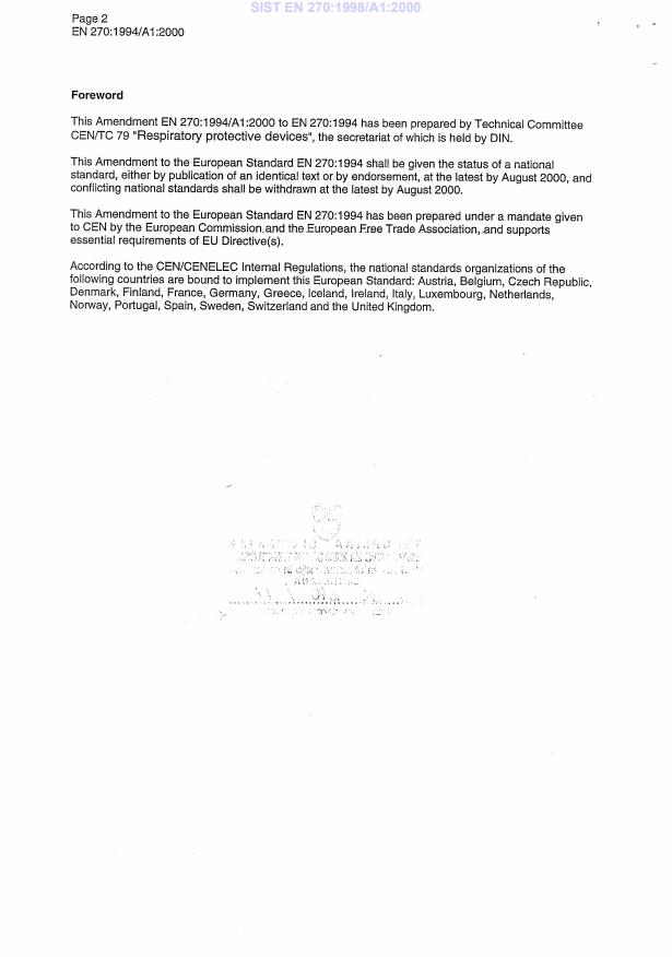 EN 270:1994/A1:2000 is a amendment published by the European Committee for Standardization (CEN). Its full title is "Respiratory protective devices - Compressed air line breathing apparatus incorporating a hood - Requirements, testing, marking". This standard covers: Migrated from Progress Sheet (TC Comment) (2000-07-10): UAP of 6 months (TC Res 212/1998) (CC/981106)