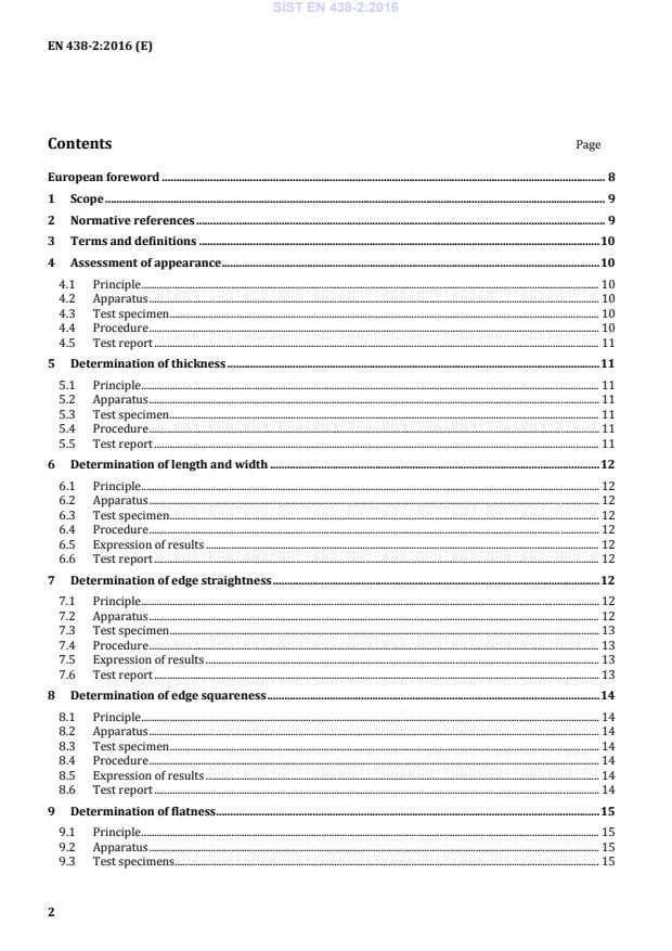 Page European foreword . 8 1 Scope . 9 2 Normative references . 9 3 Terms and definitions . 10 4 Assessment of appearance . 10 4.1 Principle . 10 4.2 Apparatus . 10 4.3 Test specimen . 10 4.4 Procedure . 10 4.5 Test report . 11 5 Determination of thickness . 11 5.1 Principle . 11 5.2 Apparatus . 11 5.3 Test specimen . 11 5.4 Procedure . 11 5.5 Test report . 11 6 Determination of length and width . 12 6.1 Principle . 12 6.2 Apparatus . 12 6.3 Test specimen . 12 6.4 Procedure . 12 6.5 Expression of results . 12 6.6 Test report . 12 7 Determination of edge straightness . 12 7.1 Principle . 12 7.2 Apparatus . 12 7.3 Test specimen . 13 7.4 Procedure . 13 7.5 Expression of results . 13 7.6 Test report . 13 8 Determination of edge squareness . 14 8.1 Principle . 14 8.2 Apparatus . 14 8.3 Test specimen . 14 8.4 Procedure . 14 8.5 Expression of results . 14 8.6 Test report . 14 9 Determination of flatness . 15 9.1 Principle . 15 9.2 Apparatus . 15 9.3 Test specimens . 15 SIST EN 438-2:2016