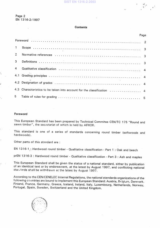 EN 1316-2:1997 is a standard published by the European Committee for Standardization (CEN). Its full title is "Hardwood round timber - Qualitative classification - Part 2: Poplar". This standard covers: This European Standard specifies a qualitative classification and grade designations for felled round timber of poplar in the form of long poles of logs. The classifications describe quality classes of round timbers for which the intended use is not known. This classification is applicable to all merchantable clones of poplar.