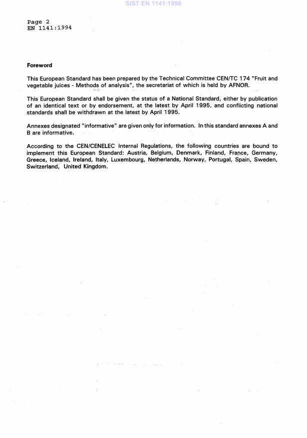 EN 1141:1994 is a standard published by the European Committee for Standardization (CEN). Its full title is "Fruit and vegetable juices - Spectrometric determination of proline content". This standard covers: This European standard specifies a method for the determination of proline in fruit and vegetable juices and related products.