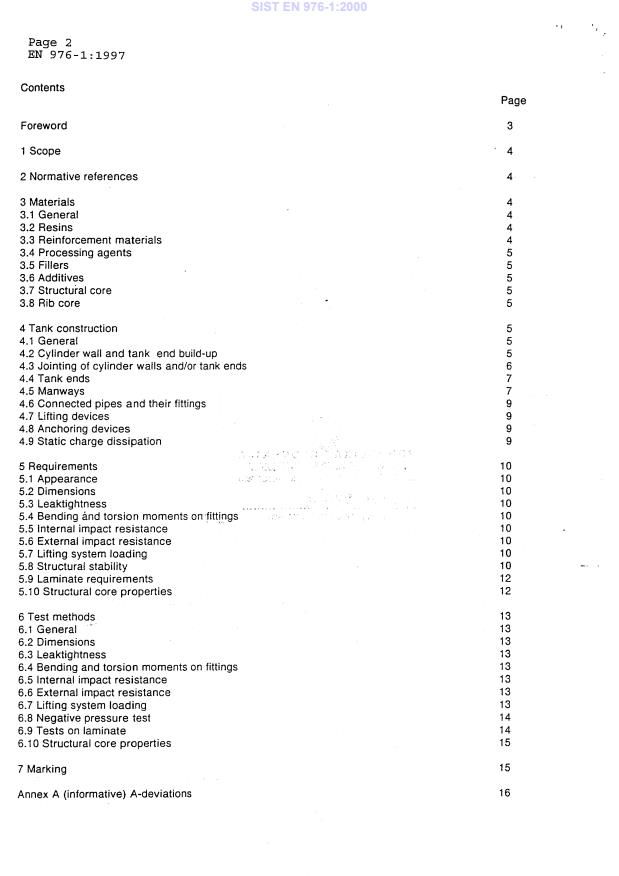 EN 976-1:1997 is a European Standard (CEN) that sets requirements and test methods for horizontal, cylindrical underground tanks made of glass‑reinforced thermosetting resins (GRP) used for the non‑pressure storage of liquid petroleum‑based fuels. Part 1 specifically covers single‑wall tanks, including tanks with one or more compartments and options with or without leak detection. The standard was adopted nationally (example: SIST EN 976-1:2000).