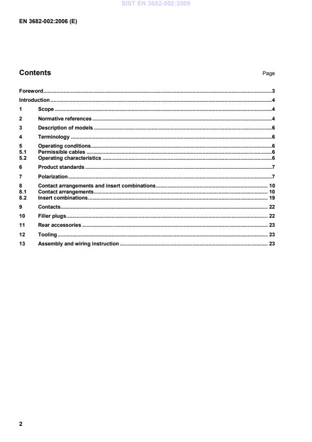 EN 3682-002:2006 is a standard published by the European Committee for Standardization (CEN). Its full title is "Aerospace series - Connectors, plug and receptacle, electrical, rectangular, interchangeable insert type, rack to panel, operating temperature 150 °C continuous - Part 002: Specification of performance and contact arrangements". This standard covers: This standard defines the common conditions for plug and receptacle, rack to panel with interchangeable insulators and continuous temperature rating 150 °C.