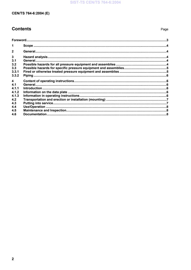 CEN/TS 764-6:2004 is a technical specification published by the European Committee for Standardization (CEN). Its full title is "Pressure equipment - Part 6: Structure and content of operating instructions". This standard covers: This part six of this document identifies the requirements for operating instructions which accompany the pressure equipment when it is placed on the market. Operating instructions shall contain the necessary safety information covering installation including assembling, putting into service and maintenance.