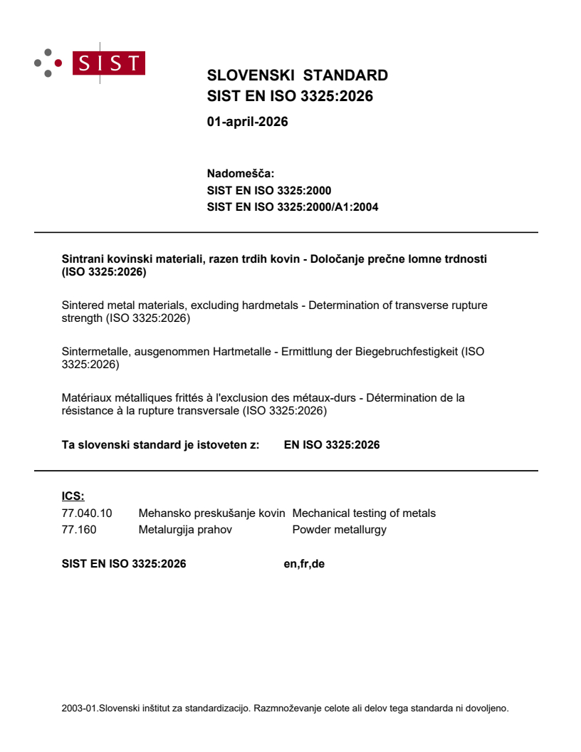 Sintrani kovinski materiali, razen trdih kovin - Določanje prečne lomne trdnosti (ISO 3325:2026)