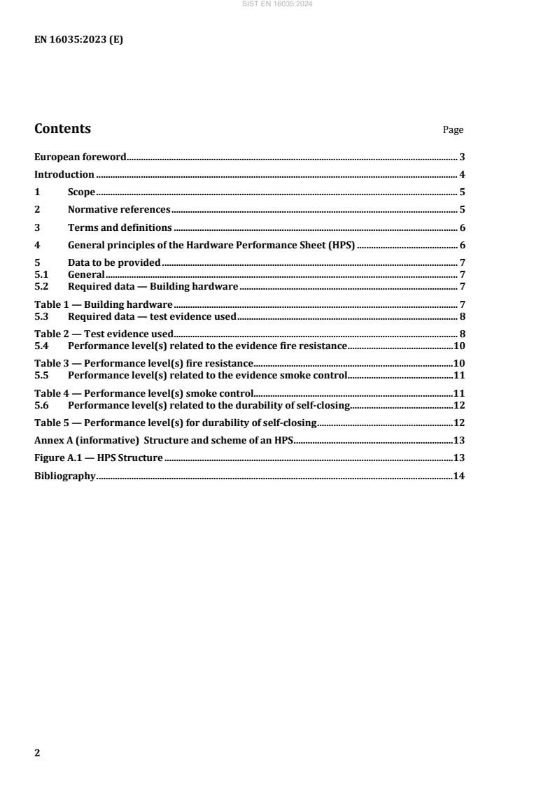 EN 16035:2023 is a standard published by the European Committee for Standardization (CEN). Its full title is "Hardware performance sheet (HPS) - Identification and summary of test evidence to facilitate the inter-changeability of building hardware for application to fire resisting and/or smoke control doorsets and/or openable windows". This standard covers: This document summarizes relevant results and classifications from tests of the fire and smoke resistance performance of building hardware in the format of a hardware performance sheet (HPS). This document provides guidance and requirements on the minimum data required as a basis for the preparation of EXAP reports for the interchangeability of building hardware on fire-retardant and/or smoke-tight doors and openable windows. This document identifies the performance characteristics and the requirements for building hardware which can be found in the appropriate product standards.