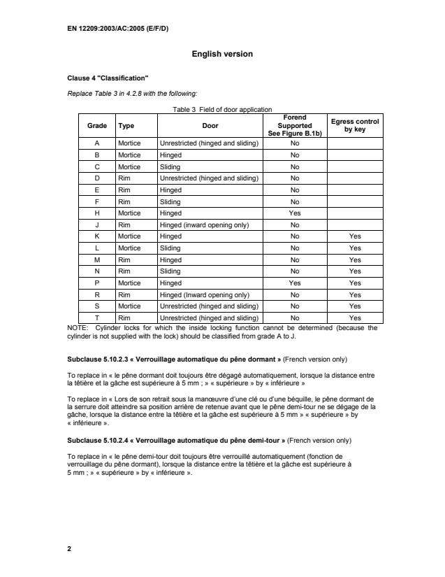 Subclause 5.10.2.4 « Verrouillage automatique du pêne demi-tour » (French version only) To replace in « le pêne demi-tour doit toujours être verrouillé automatiquement (fonction de verrouillage du pêne dormant), lorsque la distance entre la têtière et la gâche est supérieure à 5 mm ; » « supérieure » by « inférieure ».