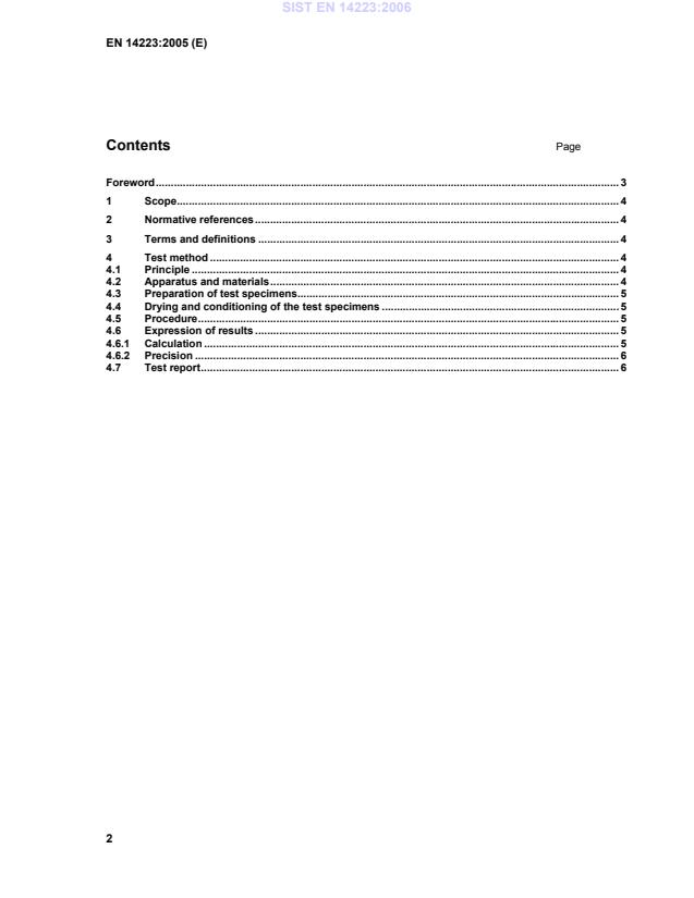 EN 14223:2005 is a standard published by the European Committee for Standardization (CEN). Its full title is "Flexible sheets for waterproofing - Waterproofing of concrete bridge decks and other concrete surfaces trafficable by vehicles - Determination of water absorption". This standard covers: This European Standard specifies a test method for the determination of water absorption in reinforced bitumen sheets which could influence the functional behaviour of these sheets. NOTE It is primarily the reinforcement's ability to absorb water which is examined by this test.