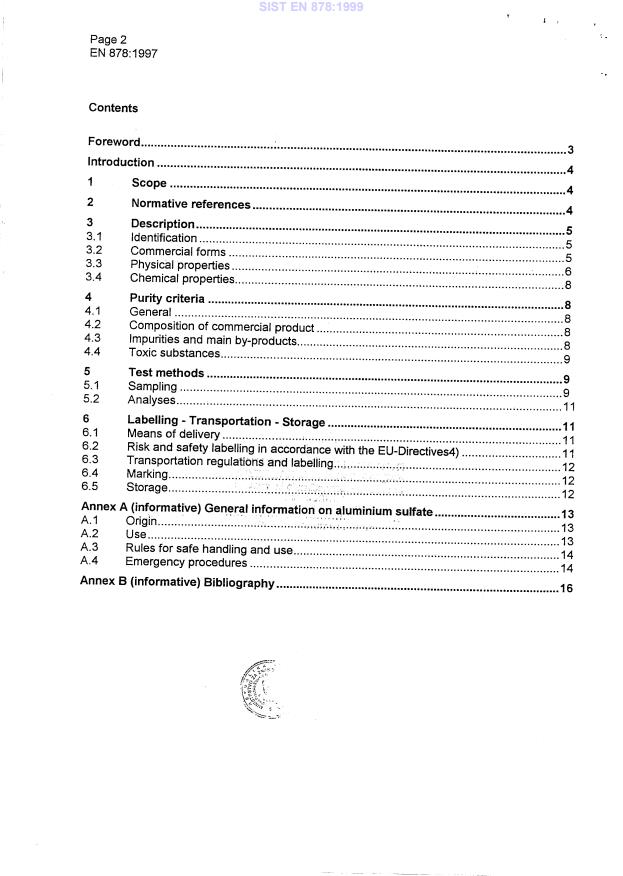 EN 878:1997 is a standard published by the European Committee for Standardization (CEN). Its full title is "Chemicals used for treatment of water intended for human consumption - Aluminium sulfate". This standard covers: This European Standard describes the characteristics and specifies the requirements of aluminium sulfate used for treatment of water intended for human consumption and gives reference to the analytical methods. It gives information on its use in water treatment.
