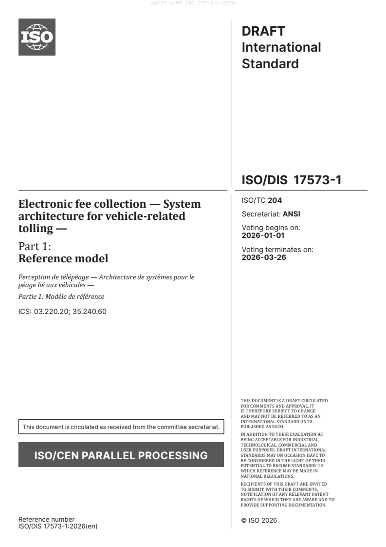 prEN ISO 17573-1 is a draft published by the European Committee for Standardization (CEN). Its full title is "Electronic fee collection - System architecture for vehicle-related tolling - Part 1: Reference model (ISO/DIS 17573-1:2025)". This standard covers: This document defines the architecture of electronic fee collection (EFC) system environments, in which a customer with one contract may use a vehicle in a variety of toll domains with a different toll charger for each domain. EFC systems conforming to this document can be used for various purposes including road (network) tolling, area tolling, collecting fees for the usage of bridges, tunnels, ferries, for access or for parking. From a technical point of view the considered toll systems may identify vehicles subject to tolling by means of electronic equipment on-board in a vehicle or by other means (e.g. automatic number plate recognition, ANPR). From a process point of view the architectural description focuses on toll determination, toll charging, and the associated enforcement measures. The actual collection of the toll, i.e. collecting payments, is outside of the scope of this document. The architecture in this document is defined with no more details than required for an overall overview, a common language, an identification of the need for and interactions among other standards, and the drafting of these standards. This document as a whole provides: — the enterprise view on the architecture, which is concerned with the purpose, scope and policies governing the activities of the specified system within the organization of which it is a part; — the terms and definitions for common use in an EFC environment; — a decomposition of the EFC systems environment into its main enterprise objects; — the roles and responsibilities of the main actors. This document does not impose that all roles perform all indicated responsibilities. It should also be clear that the responsibilities of a role may be shared between two or more actors. Mandating the performance of certain responsibilities is the task of standards derived from this architecture; — identification of the provided services by means of action diagrams that underline the needed standardised exchanges; — identification of the interoperability interfaces for EFC systems, in specialised standards (specified or to be specified).