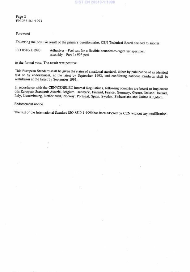 EN 28510-1:1993 is a standard published by the European Committee for Standardization (CEN). Its full title is "Adhesives - Peel test for a flexible-bonded-to-rigid test specimen assembly - Part 1: 90° peel (ISO 8510-1:1990)". This standard covers: Particularly suitable for use with less flexible adherends for which a 180 ° peel test is not suitable because the adherends crack, break or delaminate. A bonded assembly of two adherends is prepared using the adhesive under test. The adherends are then pulled apart at a steady rate, starting at the open end of the bond, in such a way that separation occurs progressively along the length of the bonded adherends. The force is applied approximately normal to the plane of the bond, through the separated part of the flexible adherend. A figure shows a schematic diagram.