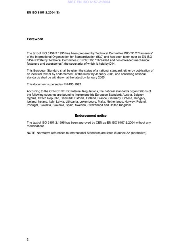 EN ISO 6157-2:2004 has the following relationships with other standards: It is inter standard links to EN 493:1992, EN 13739-2:2003, EN 1337-2:2004, EN 14861:2004, EN 663:1994, EN 14399-10:2018, EN 1667:1997, EN 14399-7:2018, EN 1663:1997, EN 14399-8:2007, EN 14399-4:2005, EN 1664:1997, EN 14399-8:2018, EN 14218:2003, EN 14399-3:2005. Understanding these relationships helps ensure you are using the most current and applicable version of the standard.