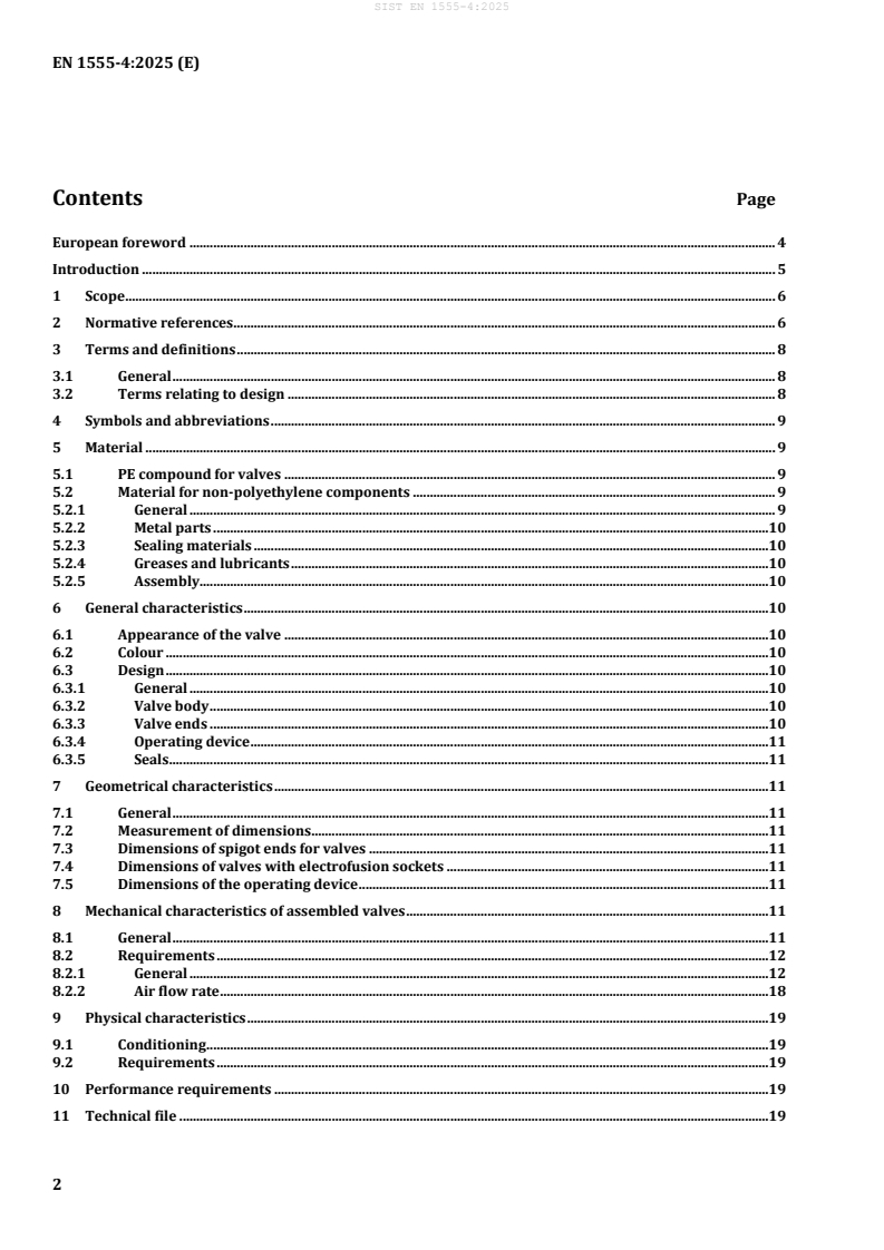 This document specifies the characteristics of valves made from polyethylene (PE) for piping systems in the field of the supply of gaseous fuels. It is applicable to isolating unidirectional and bi-directional valves with spigot ends or electrofusion sockets intended to be fused with PE pipes or fittings conforming to EN 1555 2 and EN 1555 3 respectively. Valves made from materials other than PE, designed for the supply of gaseous fuels conforming to the relevant standards can be used in PE piping systems according to EN 1555 (all parts), provided that they have PE connections for butt fusion or electrofusion ends, including integrated material transition joints, conforming to EN 1555 3. It also specifies the test parameters for the test methods referred to in this document. In conjunction with EN 1555-1, EN 1555-2, EN 1555-3 and EN 1555-5, this document is applicable to PE pipes, fittings and valves, their joints and, joints with components of PE and other materials intended to be used under the following conditions: a) a maximum operating pressure, MOP, up to and including 10 bar at a design reference temperature of 20 °C; NOTE 1 For the purpose of this document and the references to ISO 8233, MOP is considered to be nominal pressure. b) an operating temperature between −20 °C to 40 °C. For operating temperatures between 20 °C and 40 °C, derating coefficients are specified in EN 1555 5. The EN 1555 series covers a range of MOPs and gives requirements concerning colours. It is the responsibility of the purchaser or specifier to make the appropriate selections from these aspects, taking into account their particular requirements and any relevant national regulations and installation practices or codes. This document covers valve bodies designed for connection with pipes with a nominal outside diameter dn ≤ 400 mm. NOTE 2 Additional information related to the installation of PE 100-RC systems is given in EN 1555-1:2025, Annex A. NOTE 3 Additional information about the suitability of PE pipe systems for hydrogen and its admixtures is given in EN 1555-1:2025, Annex B.