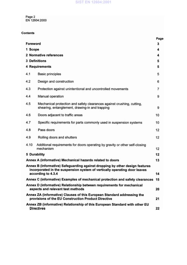 EN 12604:2000 is a standard published by the European Committee for Standardization (CEN). Its full title is "Industrial, commercial and garage doors and gates - Mechanical aspects - Requirements". This standard covers: This European Standard specifies the mechanical performance requirements of manual and power operated industrial, commercial and garage doors and gates and defines the minimum requirements to ensure the safe construction and use of doors. NOTE: Use means normal use and foreseeable misuse of the doors. A door is not part of the load carrying structure of the building. This standard is including door as: - industrial and commercial doors; - garage doors; - shutters; - barriers; - gates.