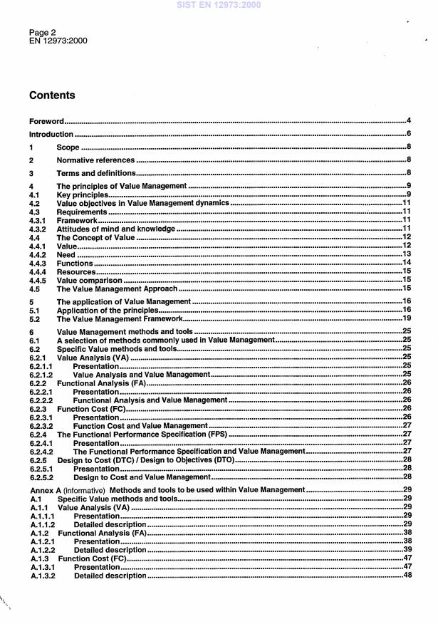 EN 12973:2000 is a standard published by the European Committee for Standardization (CEN). Its full title is "Value management". This standard covers: The purposes of this standard are: - to establish a common basis for management to implement and practice Value Management; - to help team leaders and team members to practice the methods; - to establish a basis for developing training and certifying procedures for individual competencies in Value Management; - to establish a basis for Value Management contractors to provide services; - to establish a basis for certifying companies and organisations; - to improve the quality of Value Management and stimulate innovation in its use; - to improve communication through the use of common terminology.